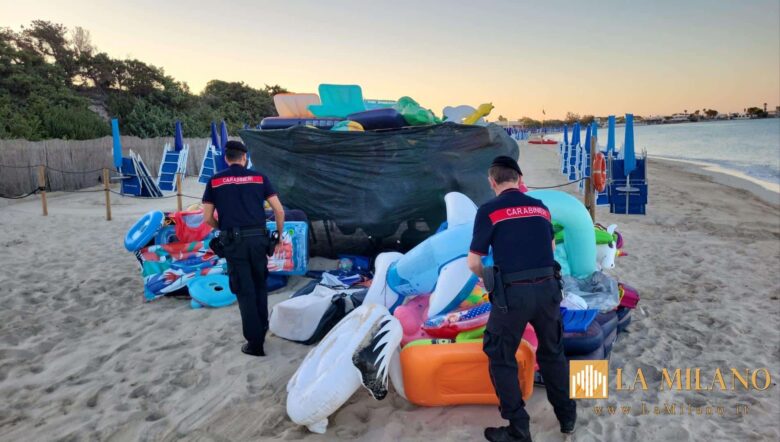Lecce, Carabinieri liberano 400 mq di spiagge salentine: sequestrati 57 ombrelloni “segnaposto” e 32mila articoli abusivi