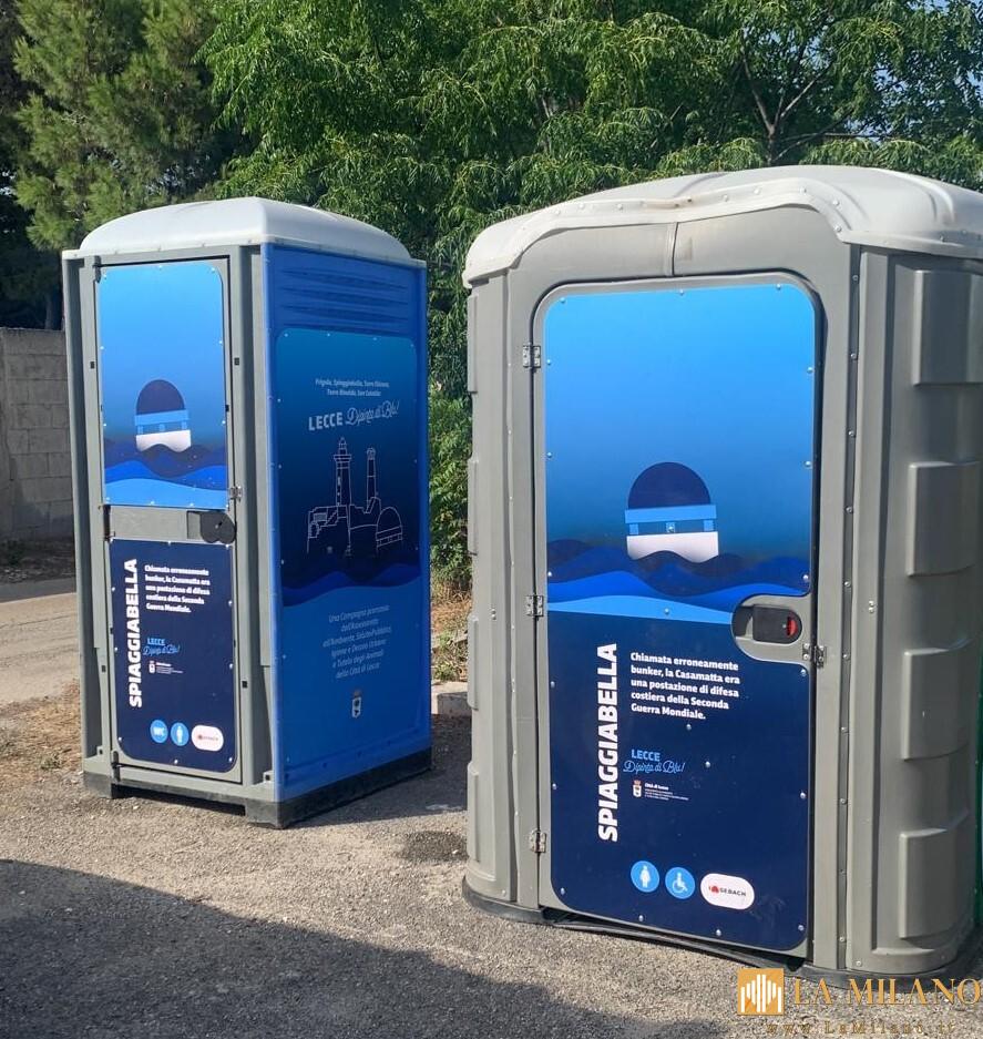 I bagni chimici collocati ogni anno nei pressi delle maggiori spiagge pubbliche delle cinque marine quest’anno si presenteranno brandizzati. Queste strutture generalmente usate nei cantieri, di norma impattanti sul paesaggio, saranno rivestite con pannellature in forex su cui spiccano i luoghi simbolo di ogni marina (il faro di San Cataldo, l’Idrovora di Frigole, la torre di avvistamento di Torre Chianca, la Casamatta di Spiaggiabella e la torre costiera di Torre Rinalda). Accanto a questi marchi identitari, ci saranno anche richiami ad alcuni dei monumenti più significativi della città: la Colonna, la statua del Santo, il Sedile e Porta Napoli, per rafforzare il legame fra la costa e il centro città.