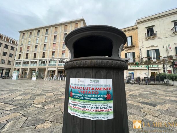 Lecce, adesivi informativi sui cestini gettacarte della città: sanzioni per i trasgressori