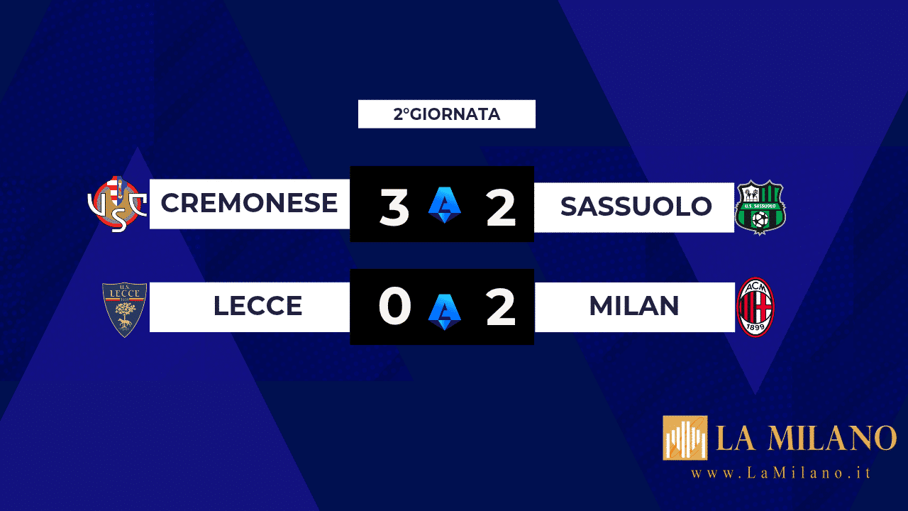 Continua lo splendido inizio di campionato della Cremonese, che dopo la vittoria nella prima giornata a San Siro, conquista altri tre punti in casa contro il Sassuolo. Si rifà invece il Milan, che dopo aver perso la prima partita (proprio contro la Cremonese) trova il primo successo a Lecce.