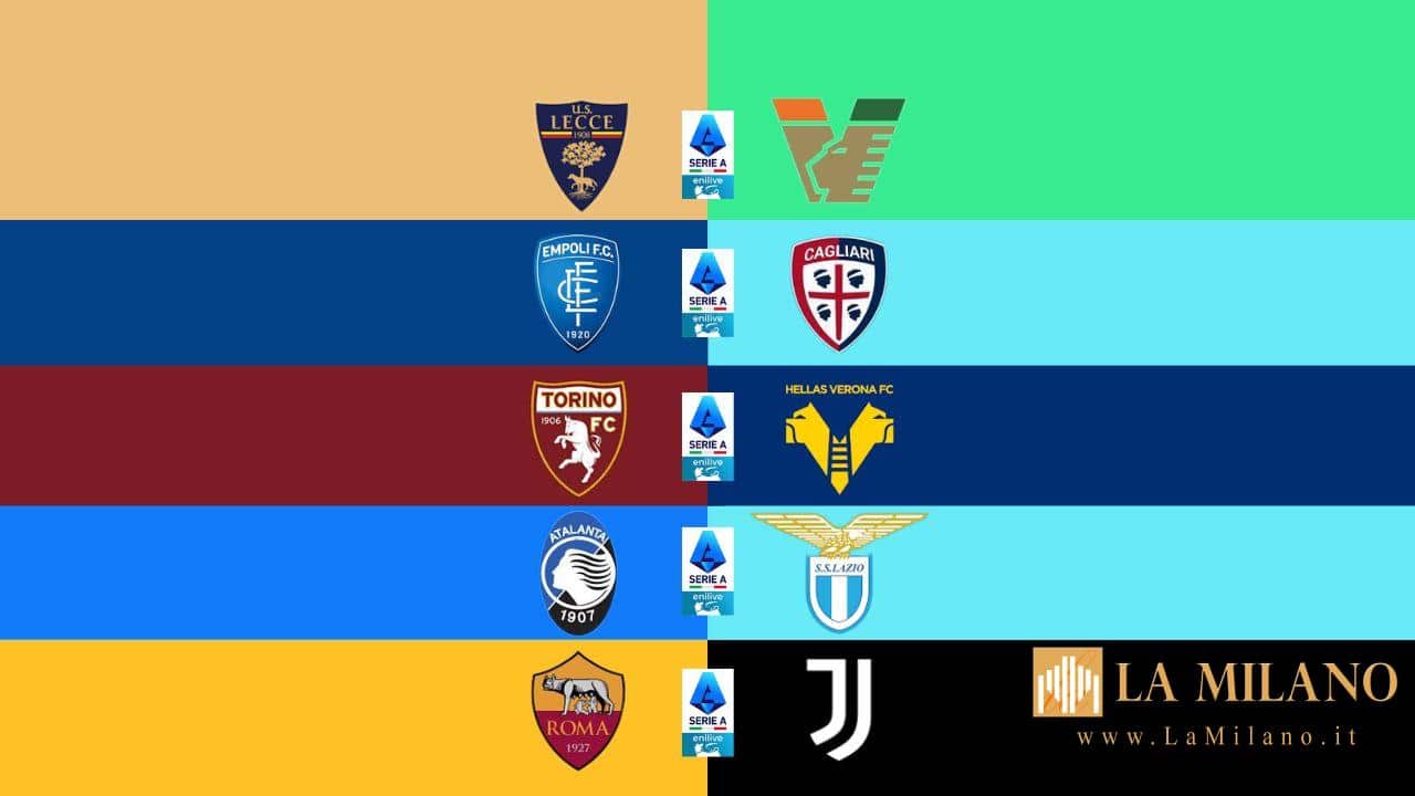 La 31° giornata di Serie A entra nel vivo questa domenica con ben cinque partite. Si parte subito con due match salvezza: alle ore 12.30 Lecce-Venezia e alle ore 15.00 Empoli-Cagliari. Sempre alle ore 15.00 scenderanno in campo anche Torino Verona, mentre alle 18.00 sarà il turno di Atalanta-Lazio. Si chiuderà alle ore 20.45 con il big match Roma-Juventus.
